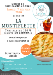 Comme chaque année, le club propose une vente de montiflette (tartiflette des monts du Lyonnais, cuisinée par nos soins) sur le marché de Saint Martin en Haut.